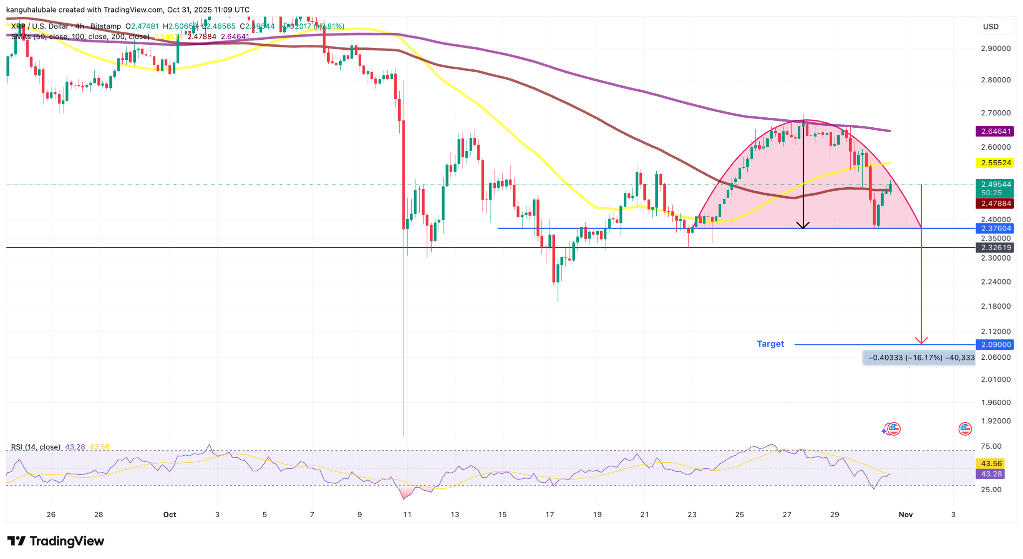 XRP’s rounded top chart pattern projects a drop to $2.09 if support levels fail to hold.