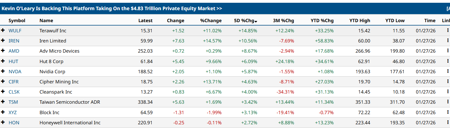 Shares of several major mining companies posted double-digit gains over the past 24 hours. TeraWulf rose about 11%, Iren Limited gained roughly 14%, and Cipher Mining climbed around 13%, according to data from Barchart.