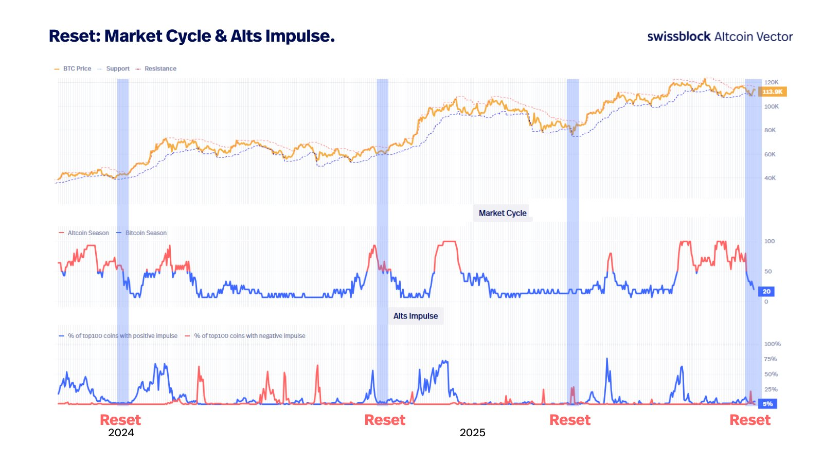Analytics platform Swissblock also said that the crypto market is resetting based on its aggregated impulse signal, which measures the exponential price structure across the top 350 assets.