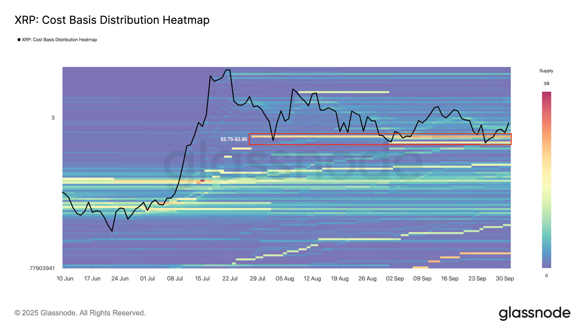 The cost basis distribution heatmap shows significant activity in this area, where nearly 4.3 billion XRP were acquired, underscoring the importance of this level.