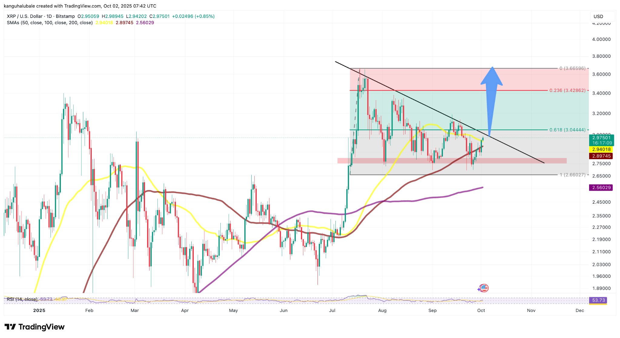 The next significant resistance is expected to be at the 0.618 Fibonacci retracement level, around $3, the triangle’s descending trendline.