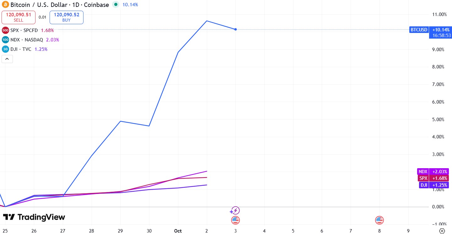 Bitcoin climbed above $120,000 on Friday as the US government shutdown stretched into its third day, fueling optimism that the world’s largest cryptocurrency by market capitalization could extend its familiar October streak, often dubbed “Uptober.”
